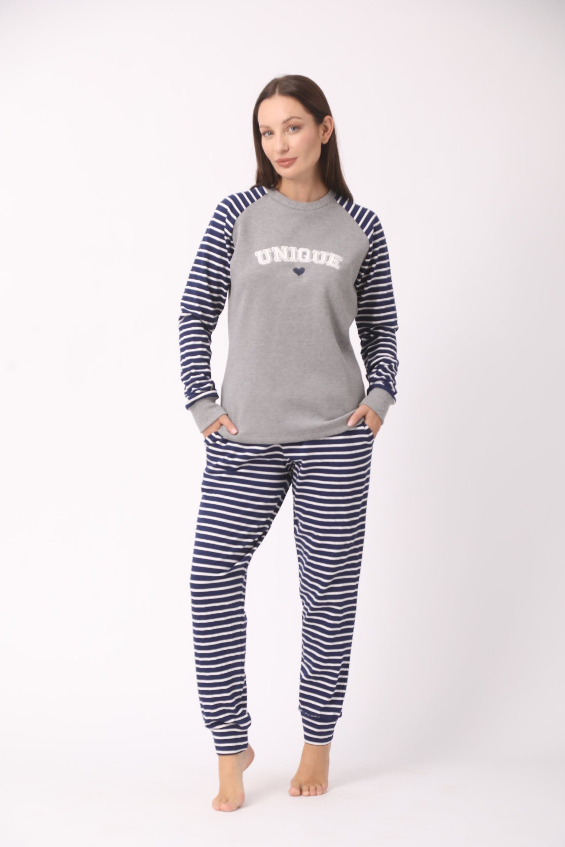 A striped pajama set made from 100% cotton for ultimate comfort. Featuring the word "Unique,"