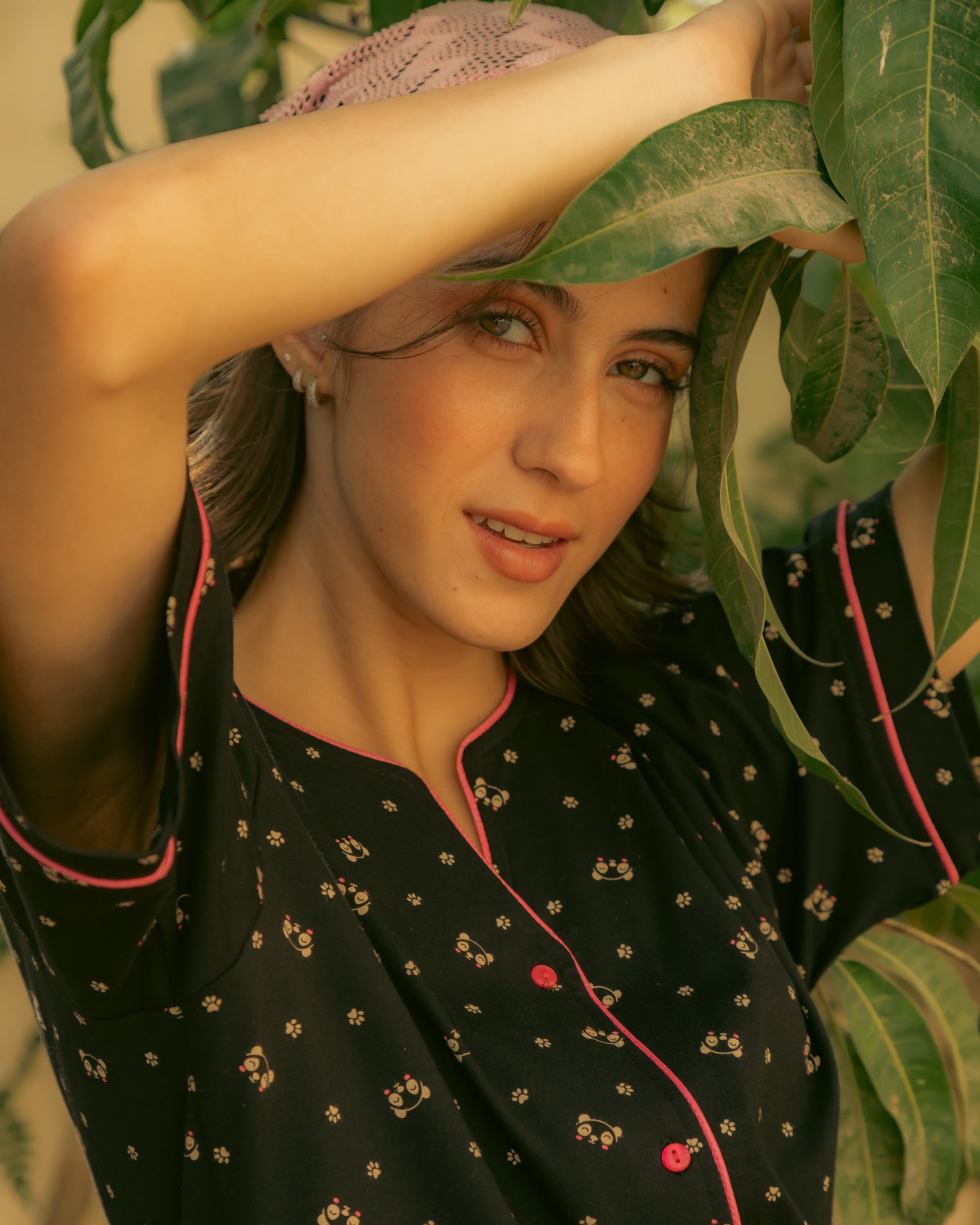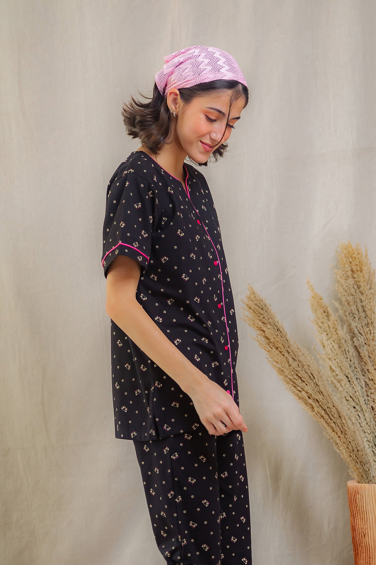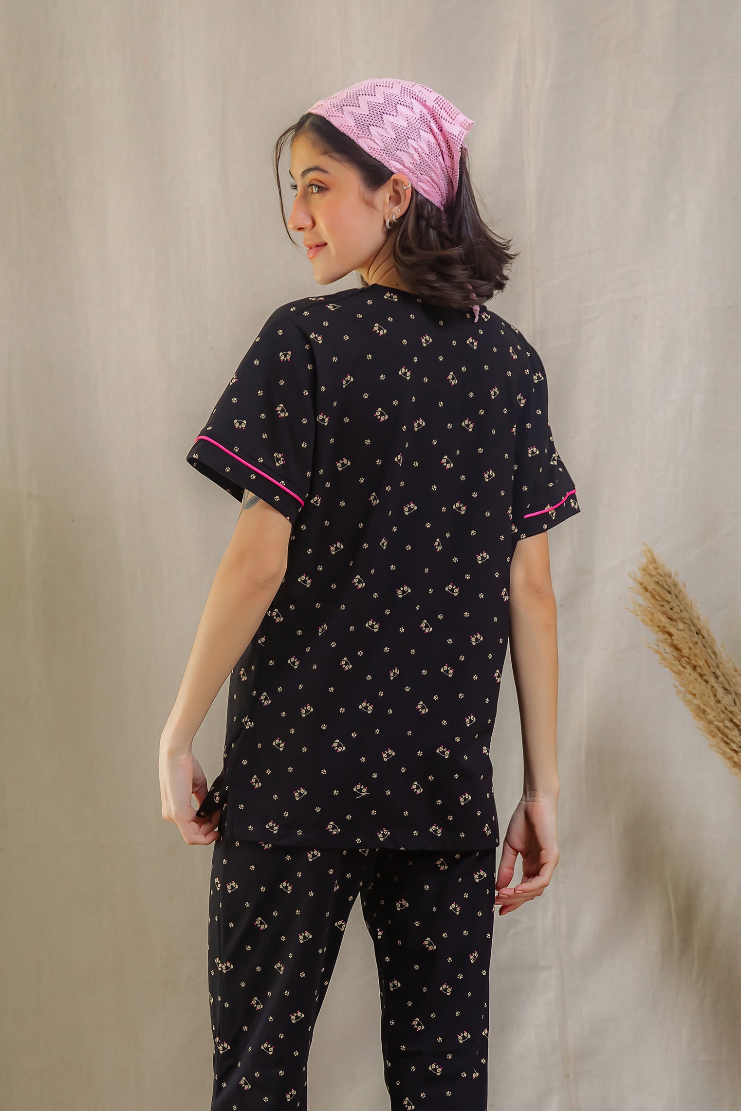 Chic black two-piece pajama set with tiny floral prints and bright pink piping. Made from soft cotton for all-day comfort.