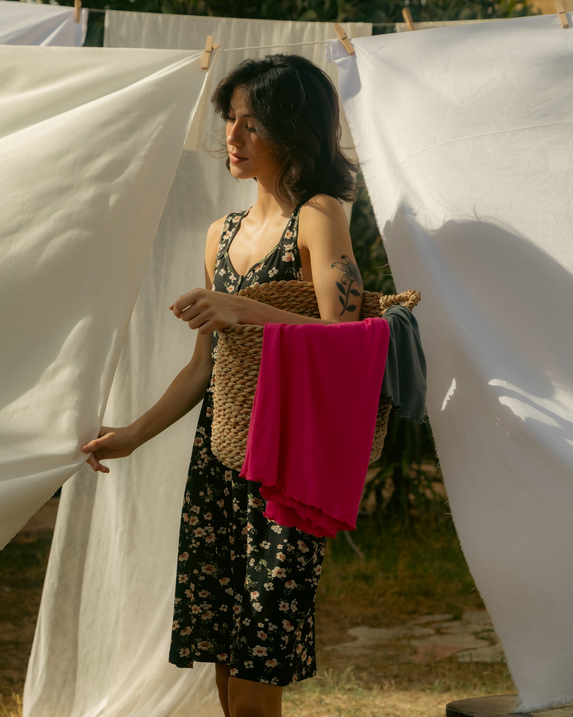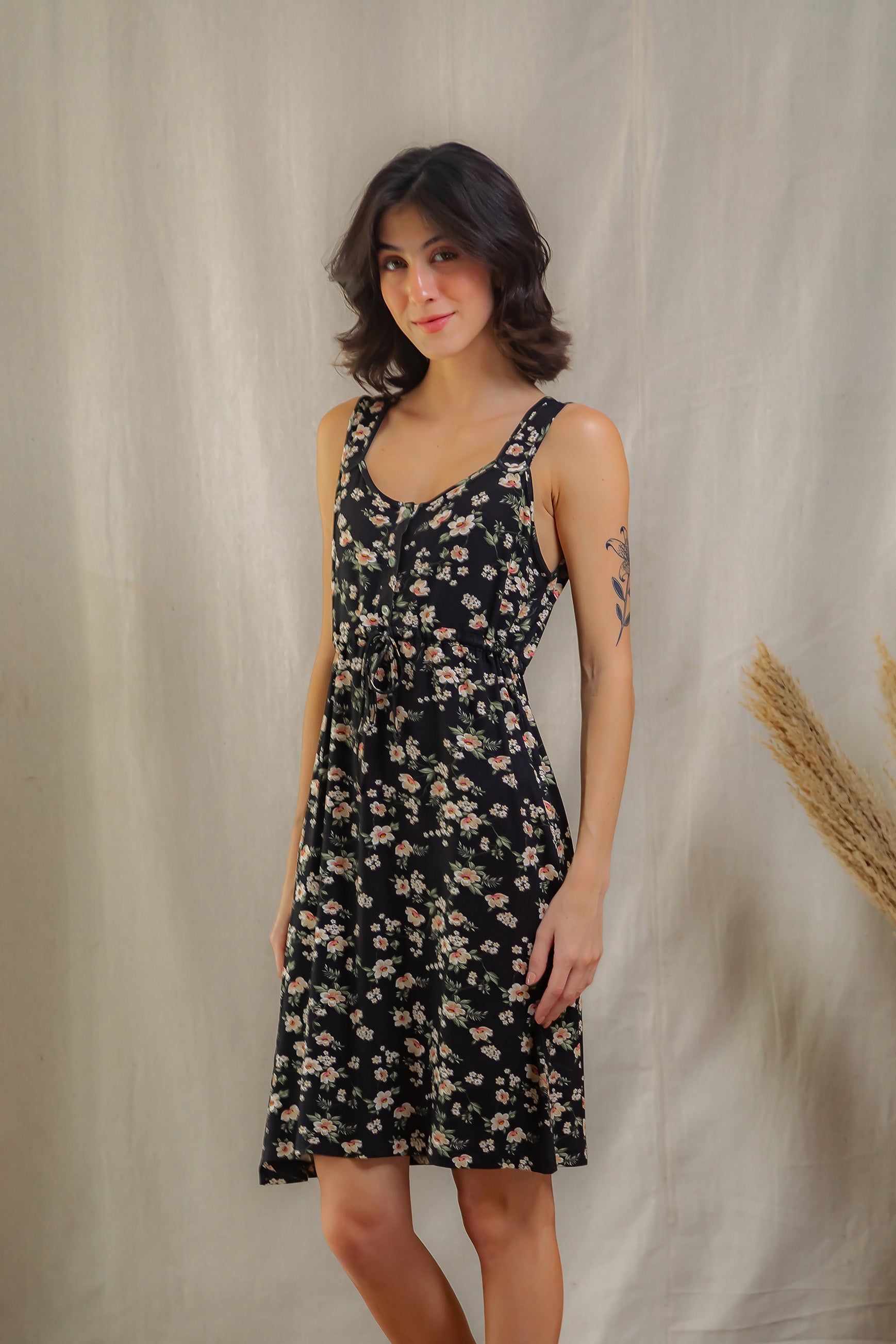 Soft, feminine, and effortlessly elegant. This floral-print sleep dress features wide straps, a flattering neckline, and a front-tie detail that cinches gently at the waist. The black background makes the delicate blossoms pop—perfect for slow mornings or breezy evenings