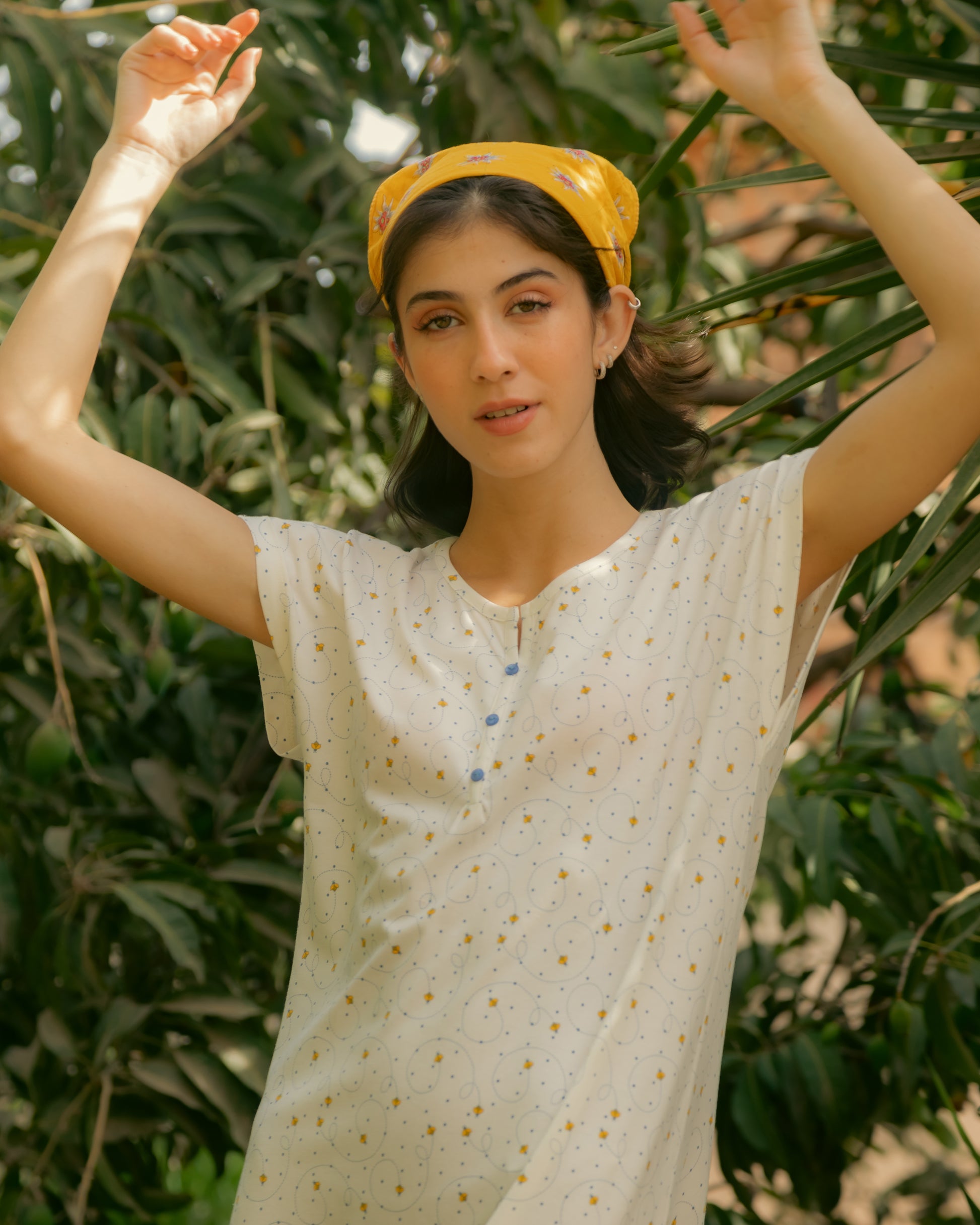 Wrap yourself in charm with our Swirly Bees Nightshirt — where comfort meets cuteness. Made from ultra-soft cotton, this breezy piece features a delicate print of swirling stars and playful bees that add a whimsical touch to your bedtime look. The relaxed silhouette and cap sleeves offer all-night ease, while the subtle button detail adds just the right hint of sweetness.