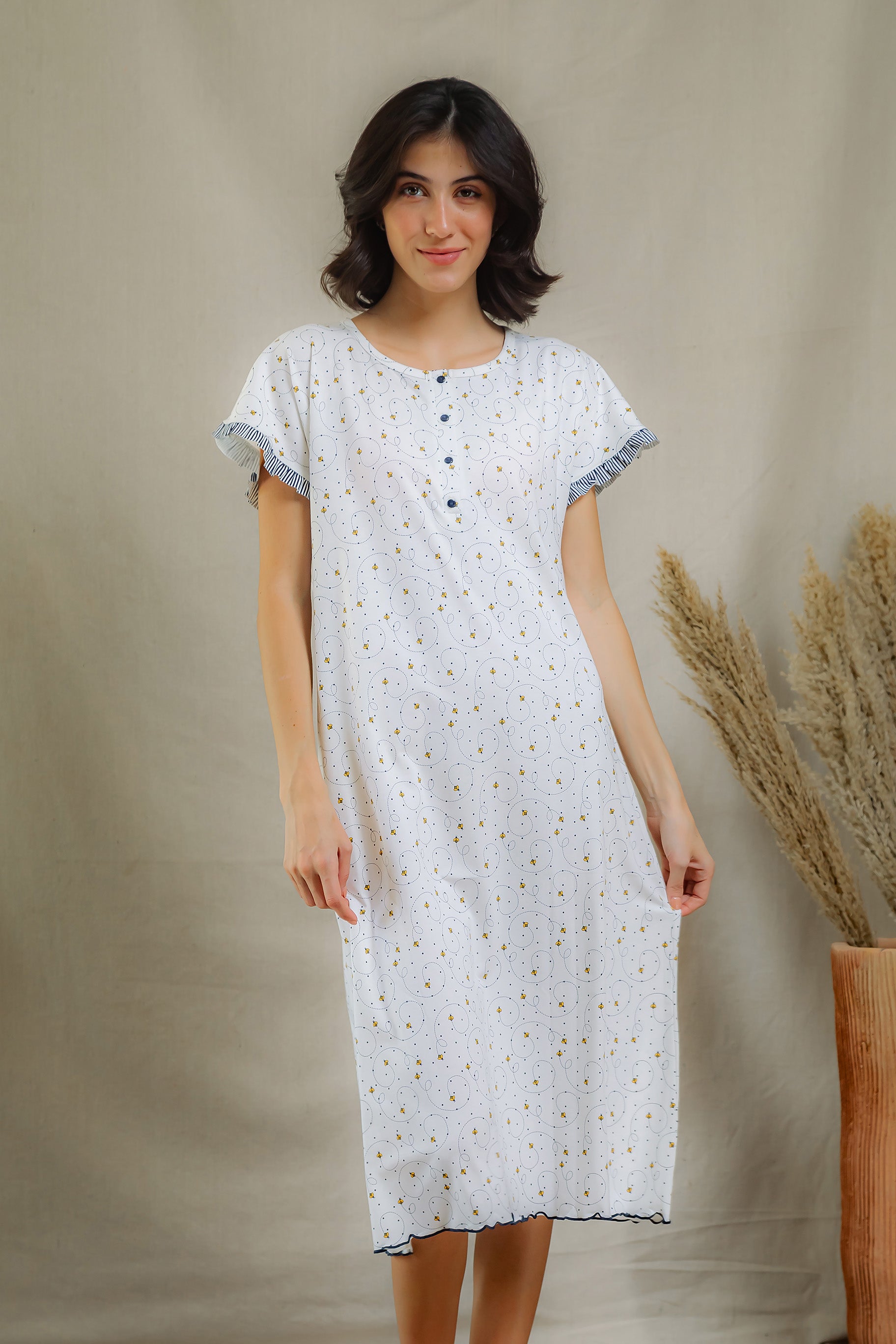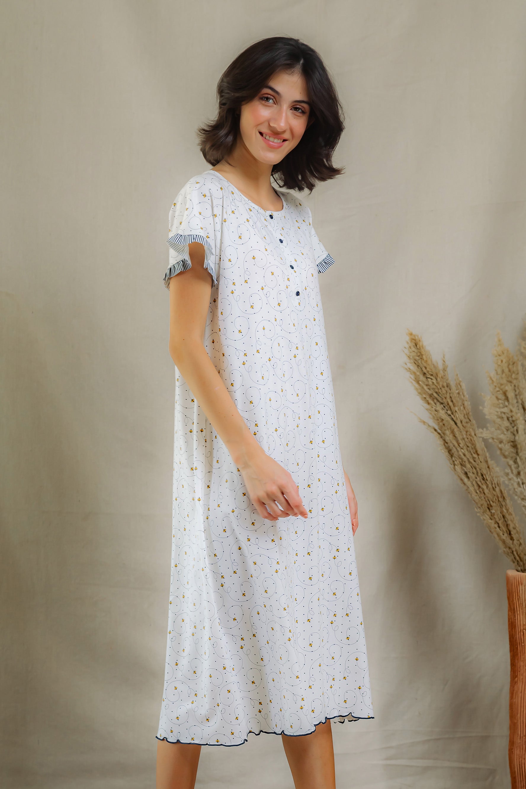 Embrace cozy evenings in the Bee Calm Buttoned Nightshirt, a playful take on feminine comfort