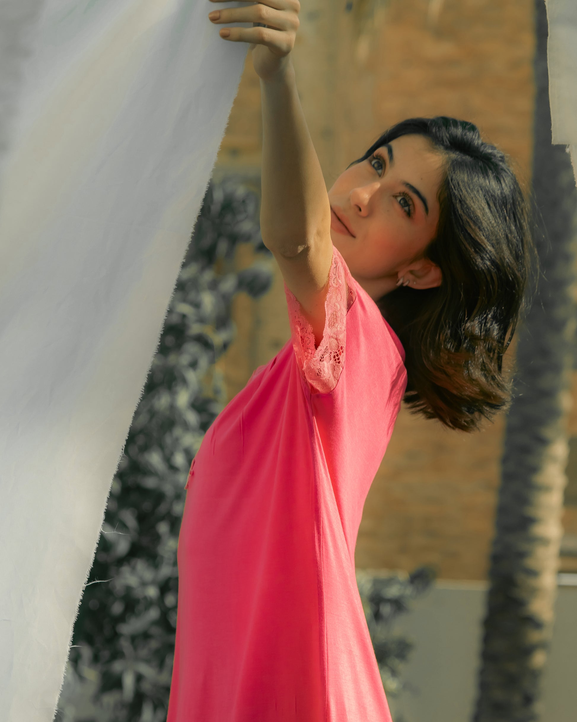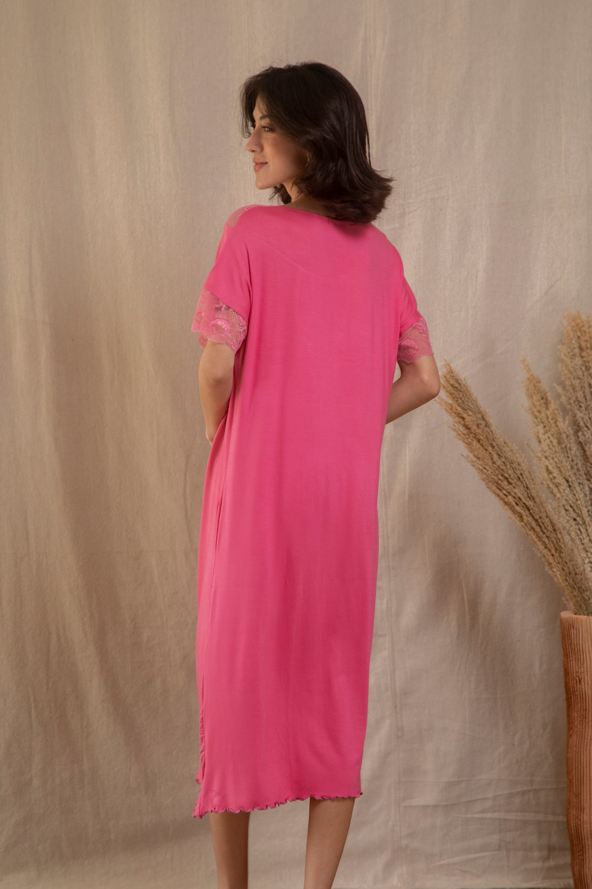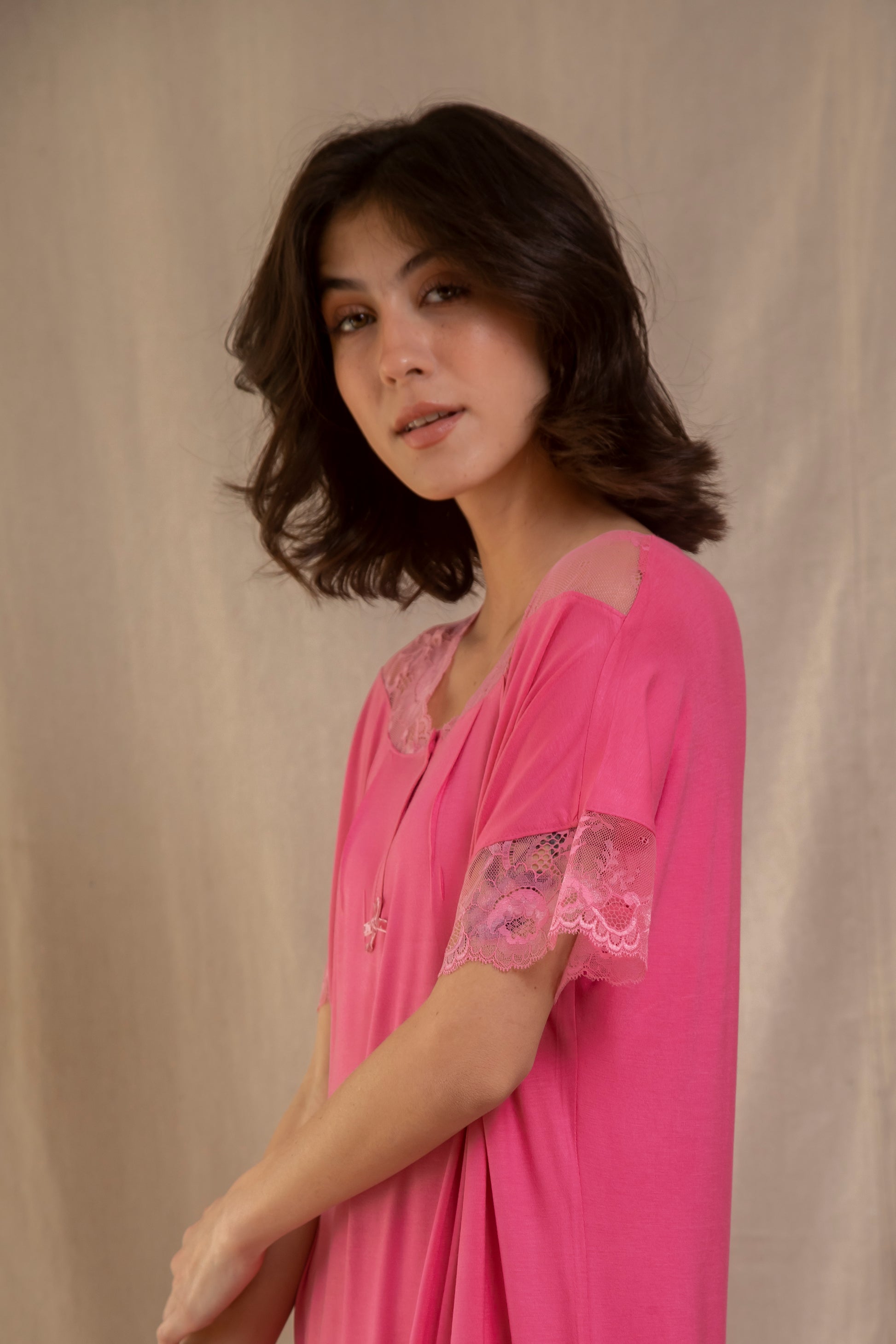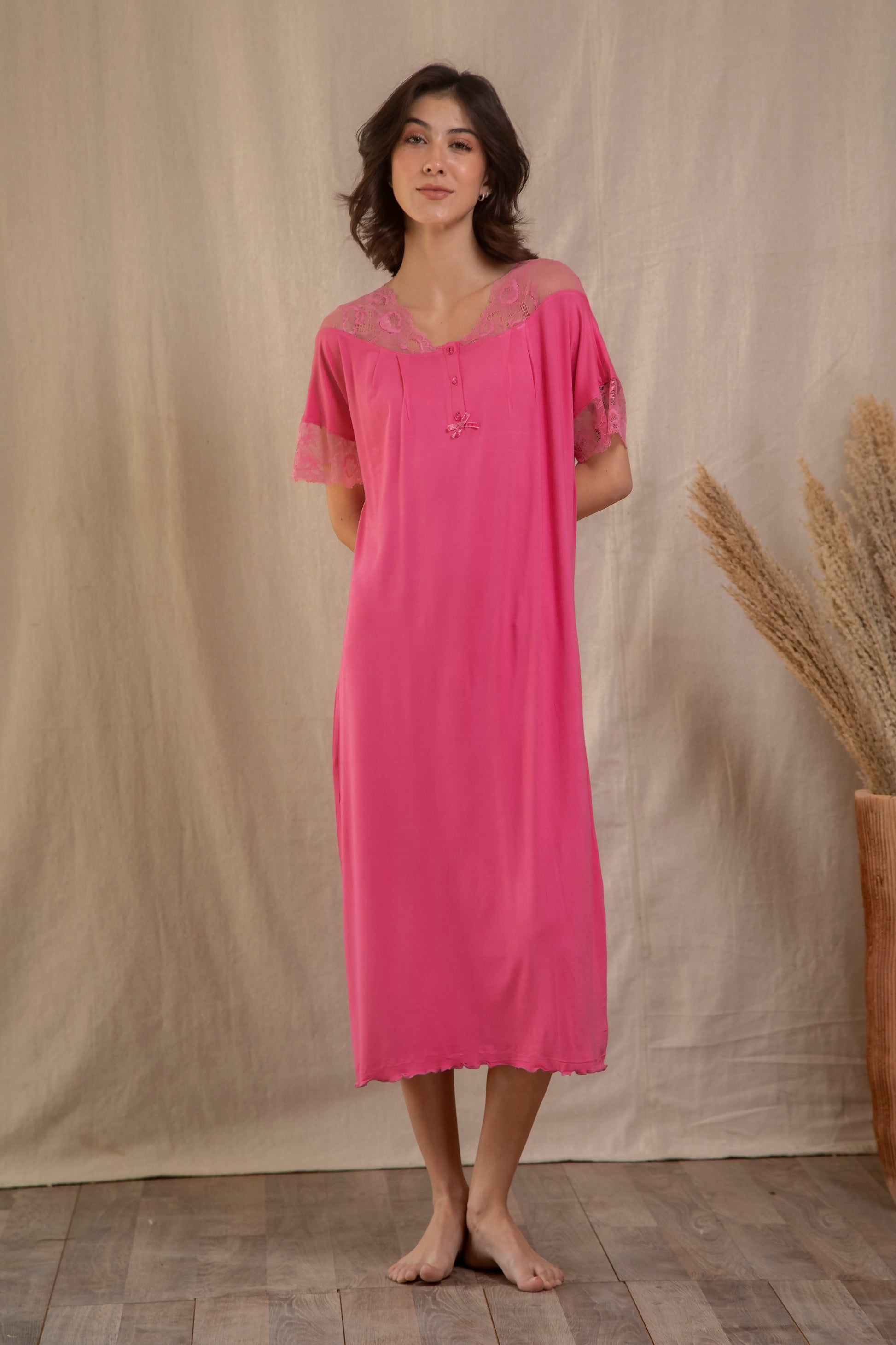 Soft, elegant, and irresistibly feminine — the Solid Gown brings timeless charm to your sleepwear collection. Made from luxuriously Viscose fabric in Rose and Fuchsia , this midi nightdress drapes effortlessly for a flattering silhouette. The wide lace yoke and flutter sleeves add a romantic touch, delicately framing the shoulders with floral sheer detailing.