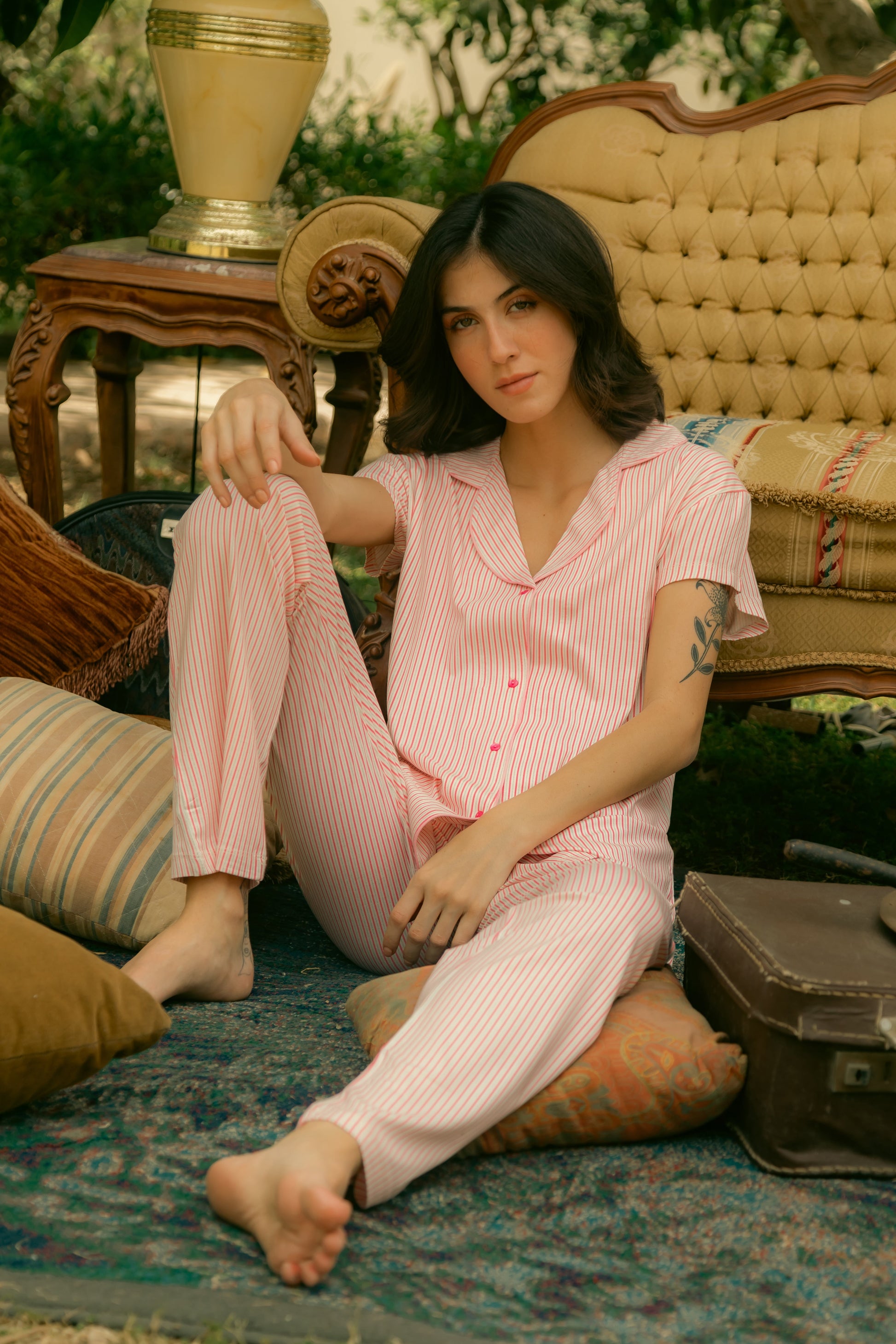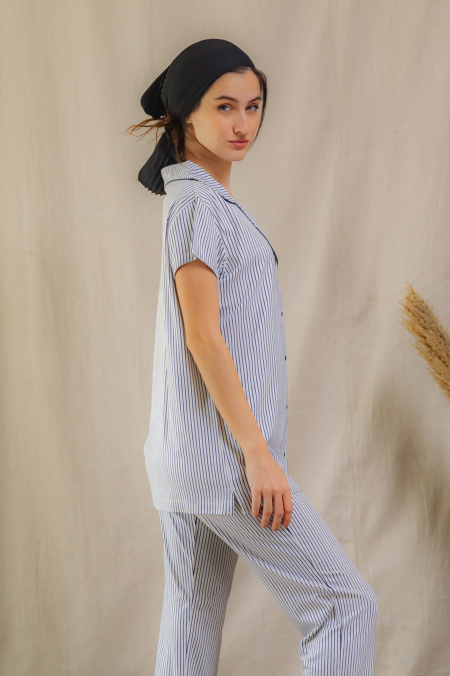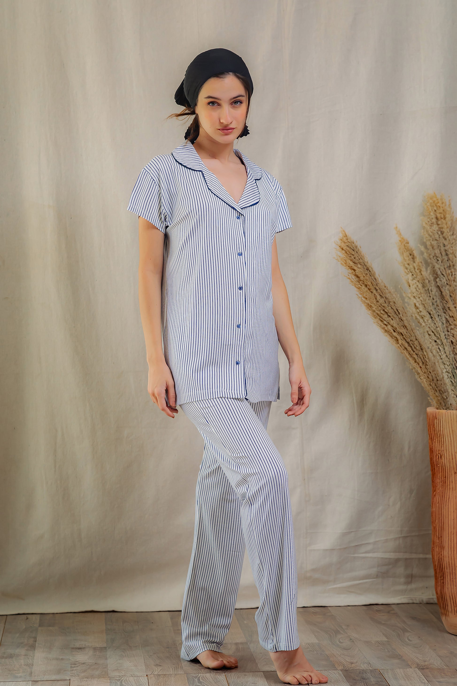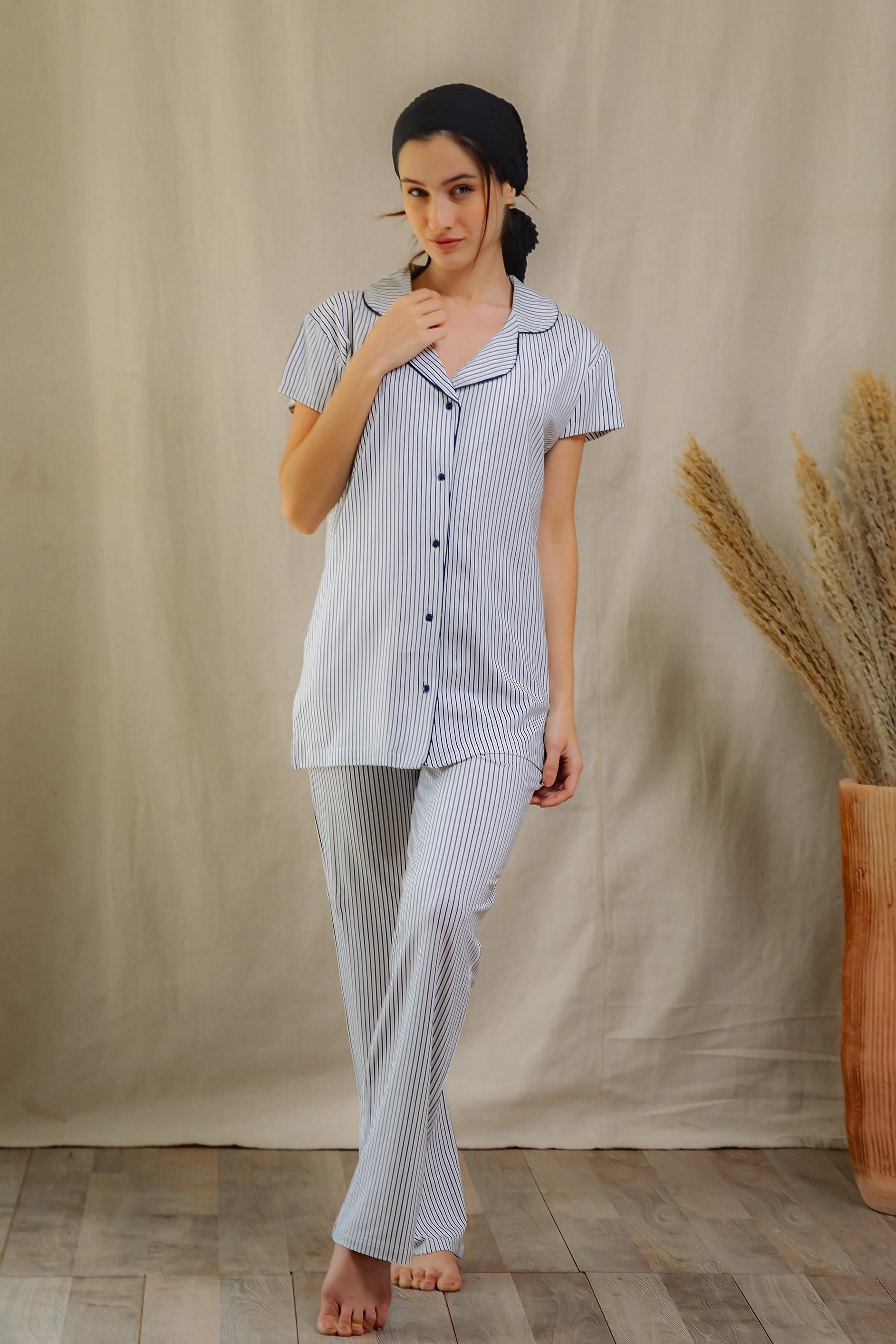 Relax in style with this effortlessly Classic striped pajama set, designed for all-day comfort and elegance. Featuring a short-sleeved, button-down top with a notched collar and soft, breathable fabric, this set combines classic tailoring with a cozy fit. The straight-leg pants complete the look, offering ease of movement and a flattering silhouette. Perfect for lounging at home or winding down after a long day, this set is a timeless wardrobe essential.