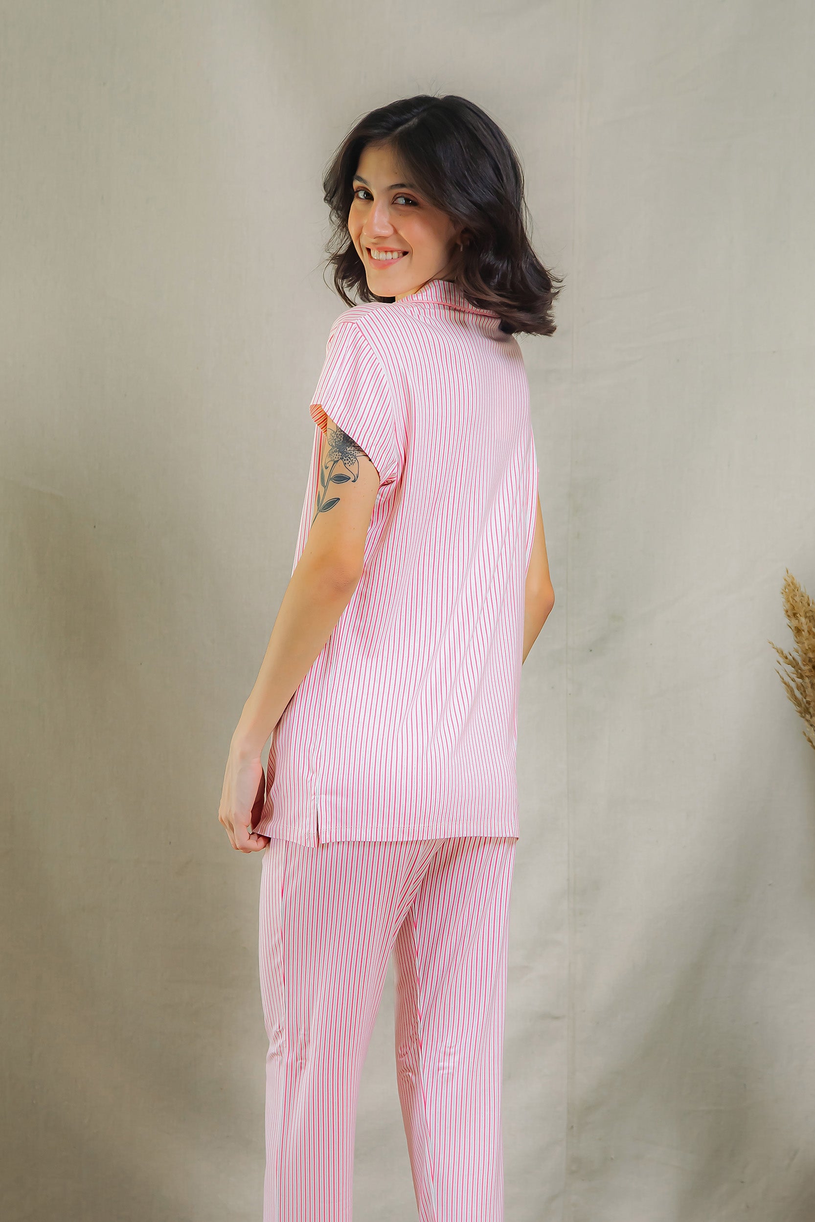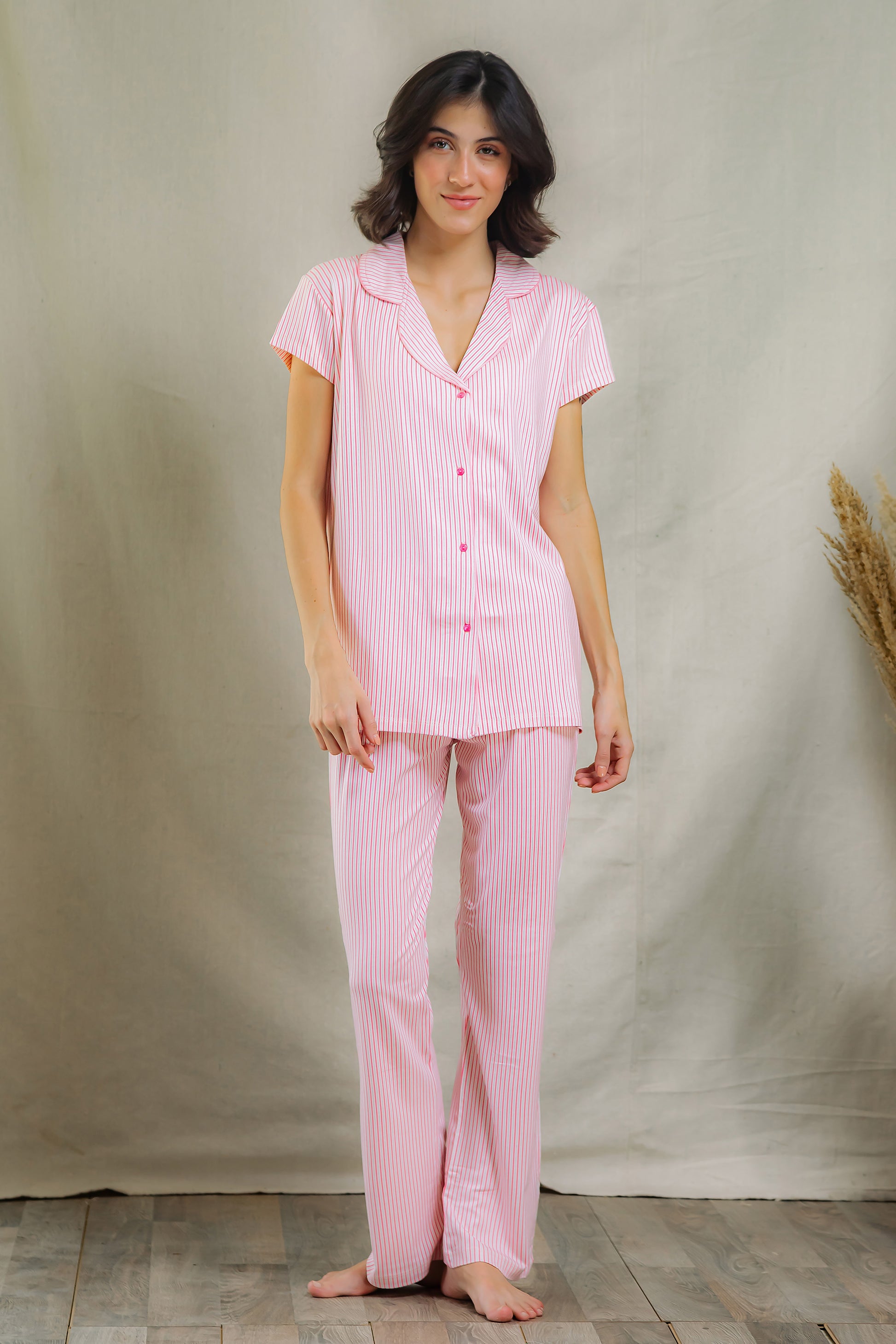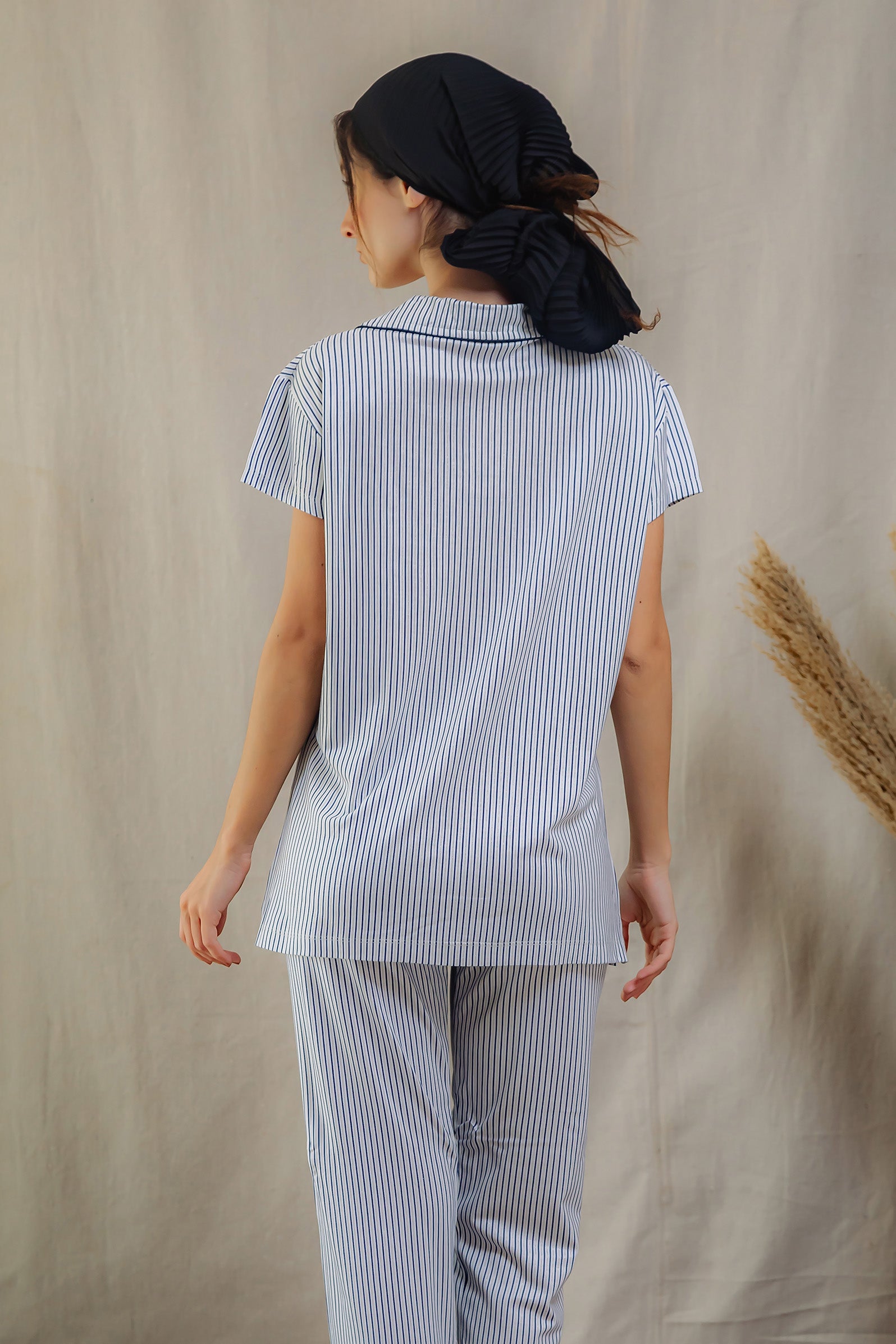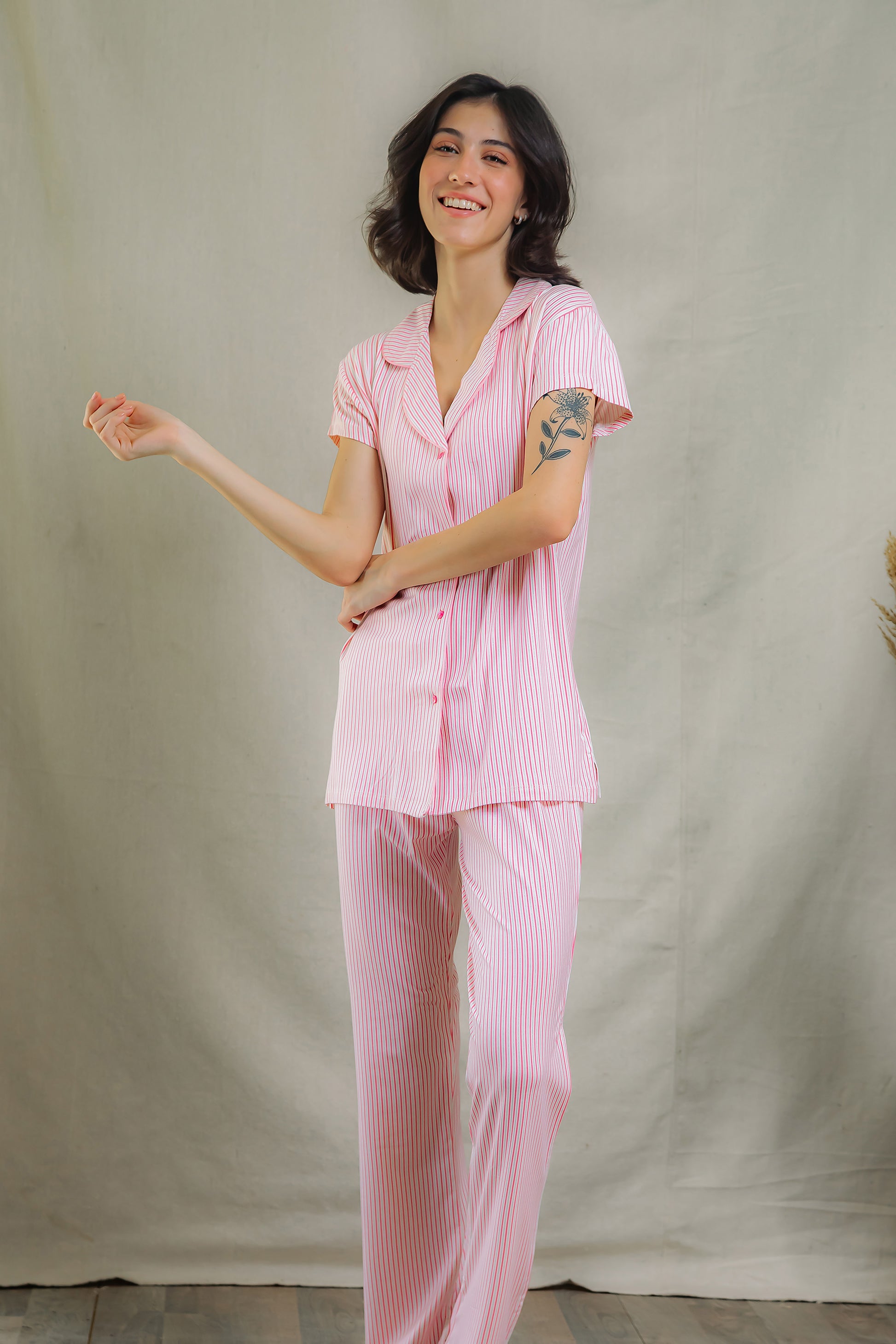 Relax in style with this effortlessly Classic striped pajama set, designed for all-day comfort and elegance. Featuring a short-sleeved, button-down top with a notched collar and soft, breathable fabric, this set combines classic tailoring with a cozy fit. The straight-leg pants complete the look, offering ease of movement and a flattering silhouette. Perfect for lounging at home or winding down after a long day, this set is a timeless wardrobe essential.