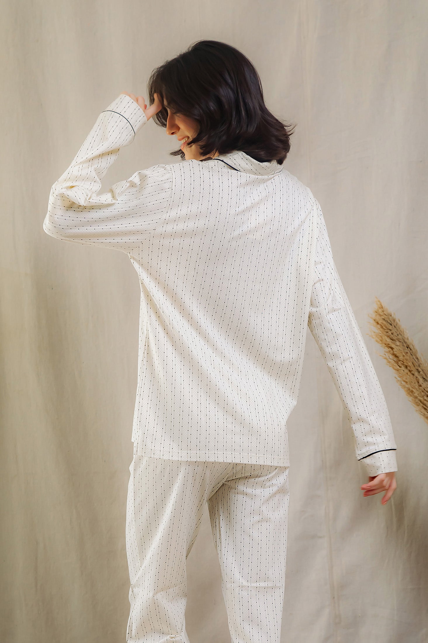 Elegant, effortless, and endlessly soft — the Dotted Lines Pajama Set is your go-to for timeless comfort. This full-length pajama set features a relaxed-fit long-sleeve top with black contrast piping and classic button closure, paired with straight-leg pants in a creamy and Rose base and fine dotted stripes.