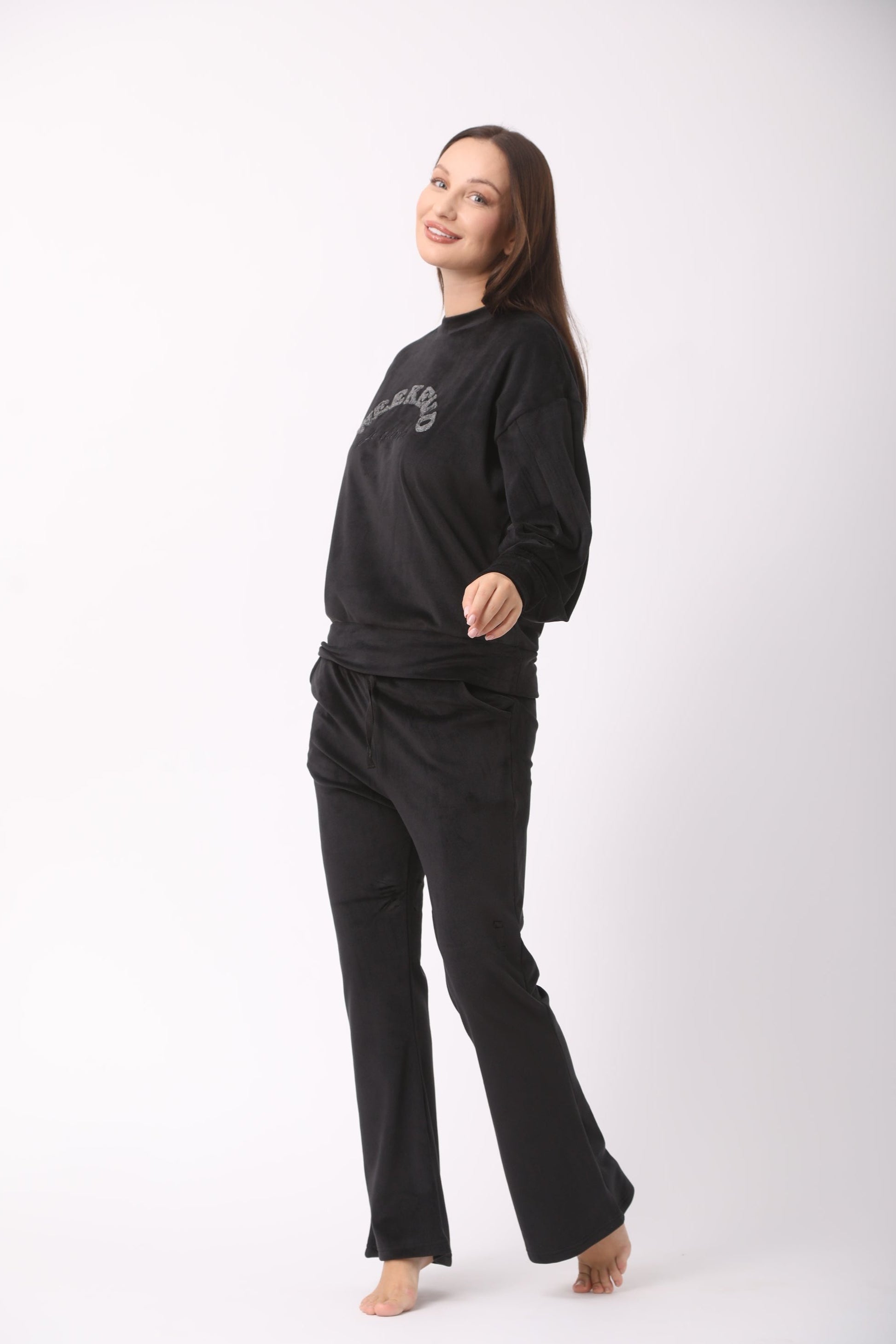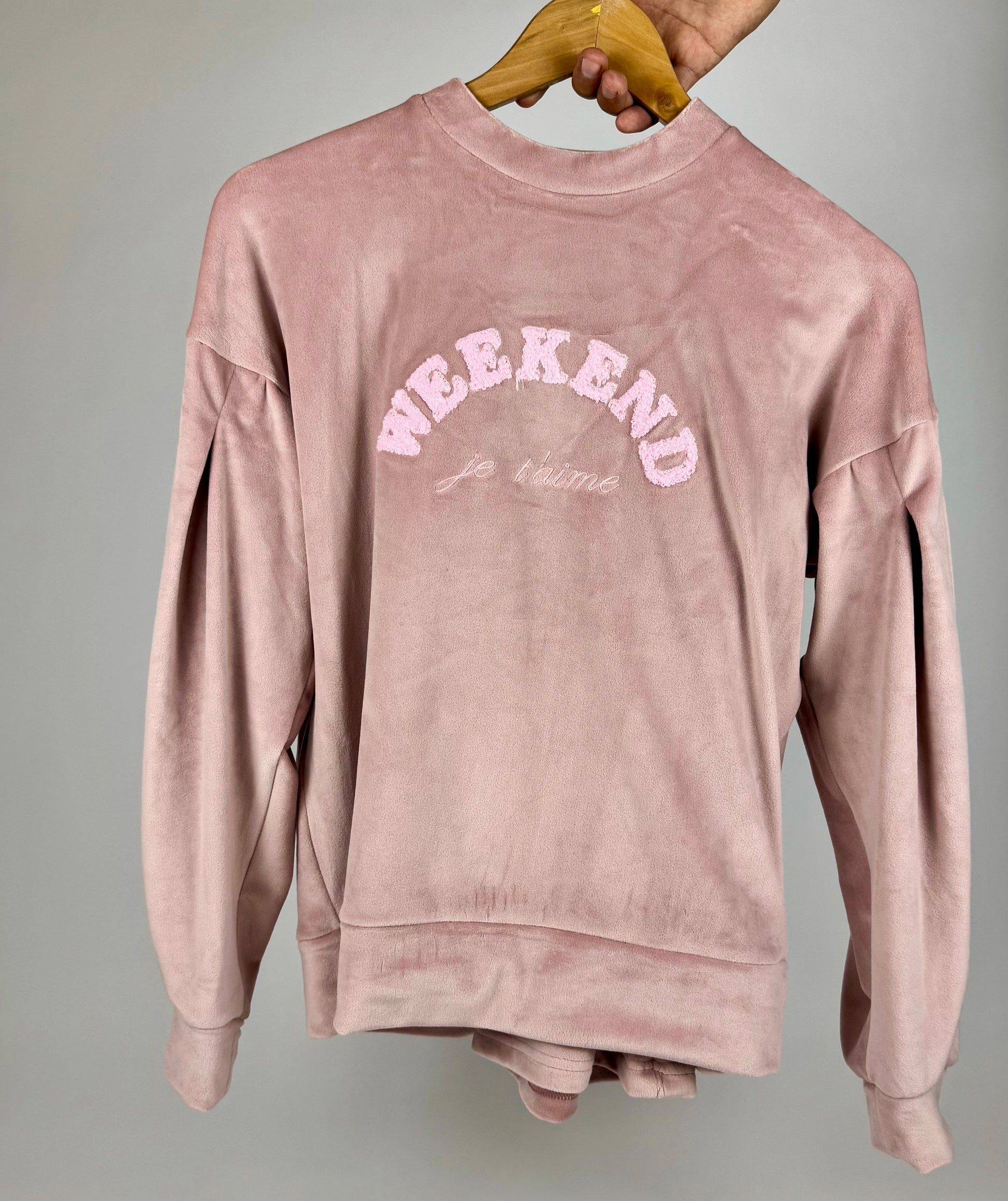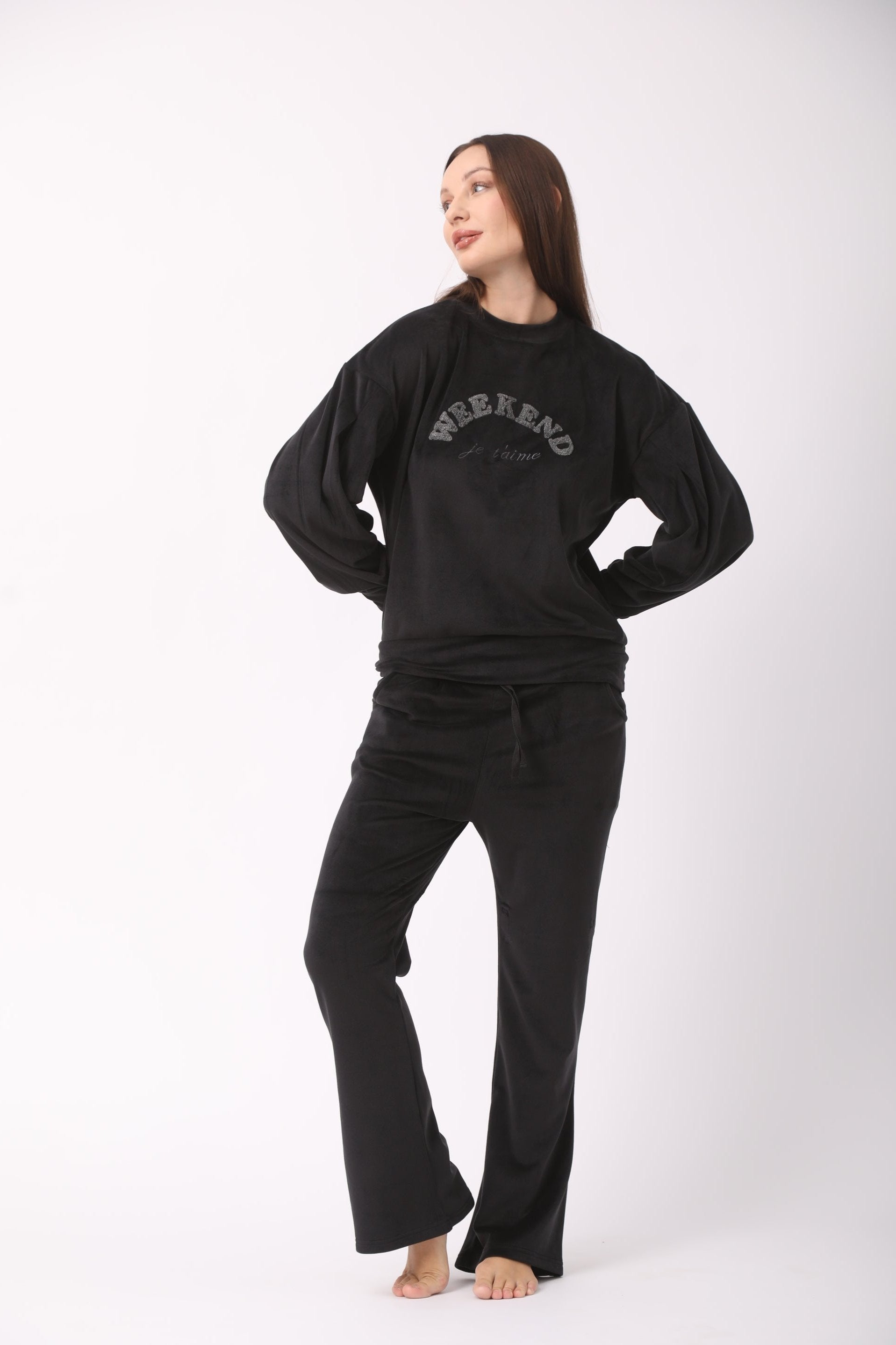 A velvet pajama set designed for cozy comfort. Featuring the word "Weekend," it’s perfect for
