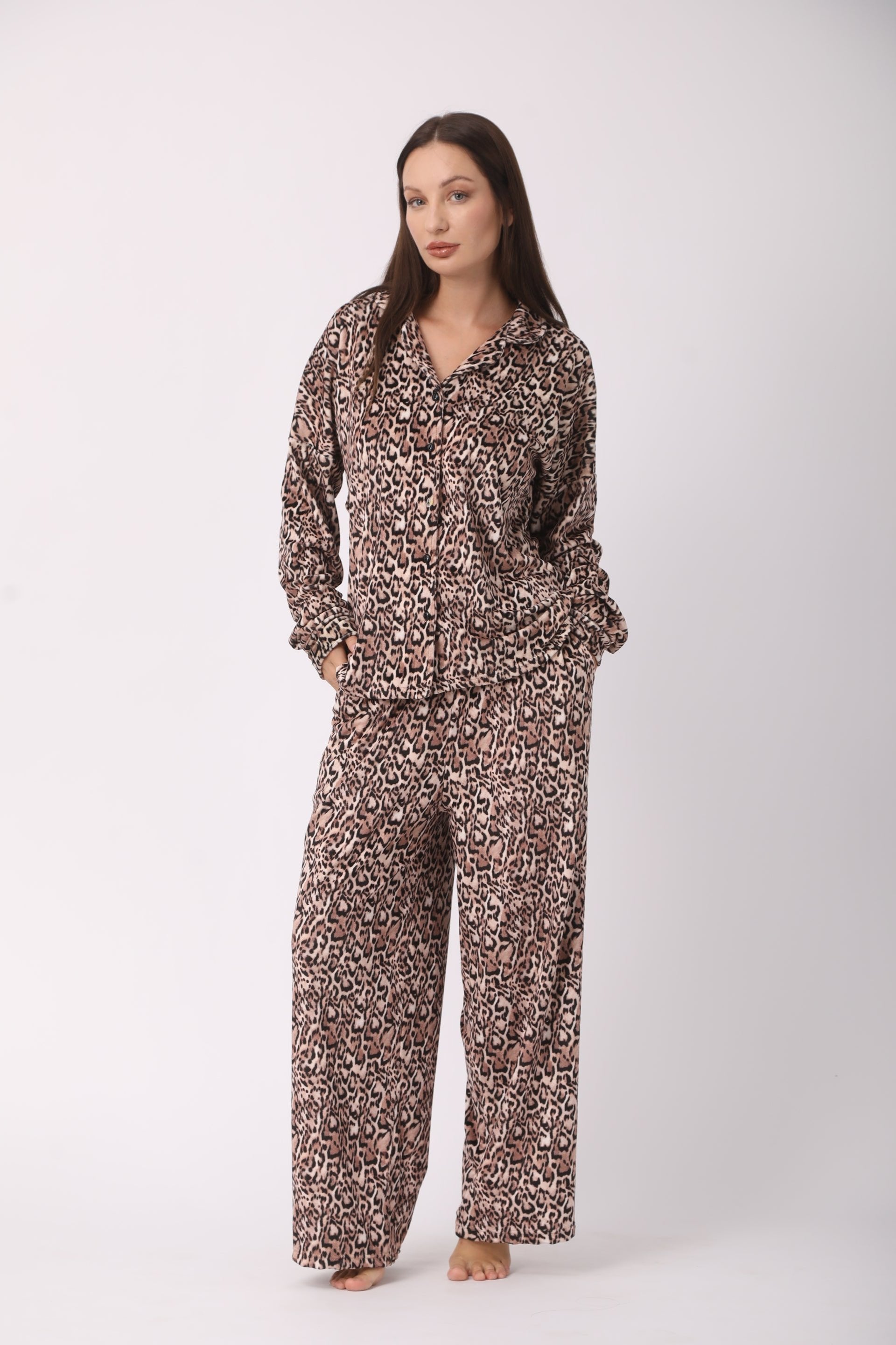 A bold pajama set featuring a chic cheetah print, offering both style and comfort for lounging or