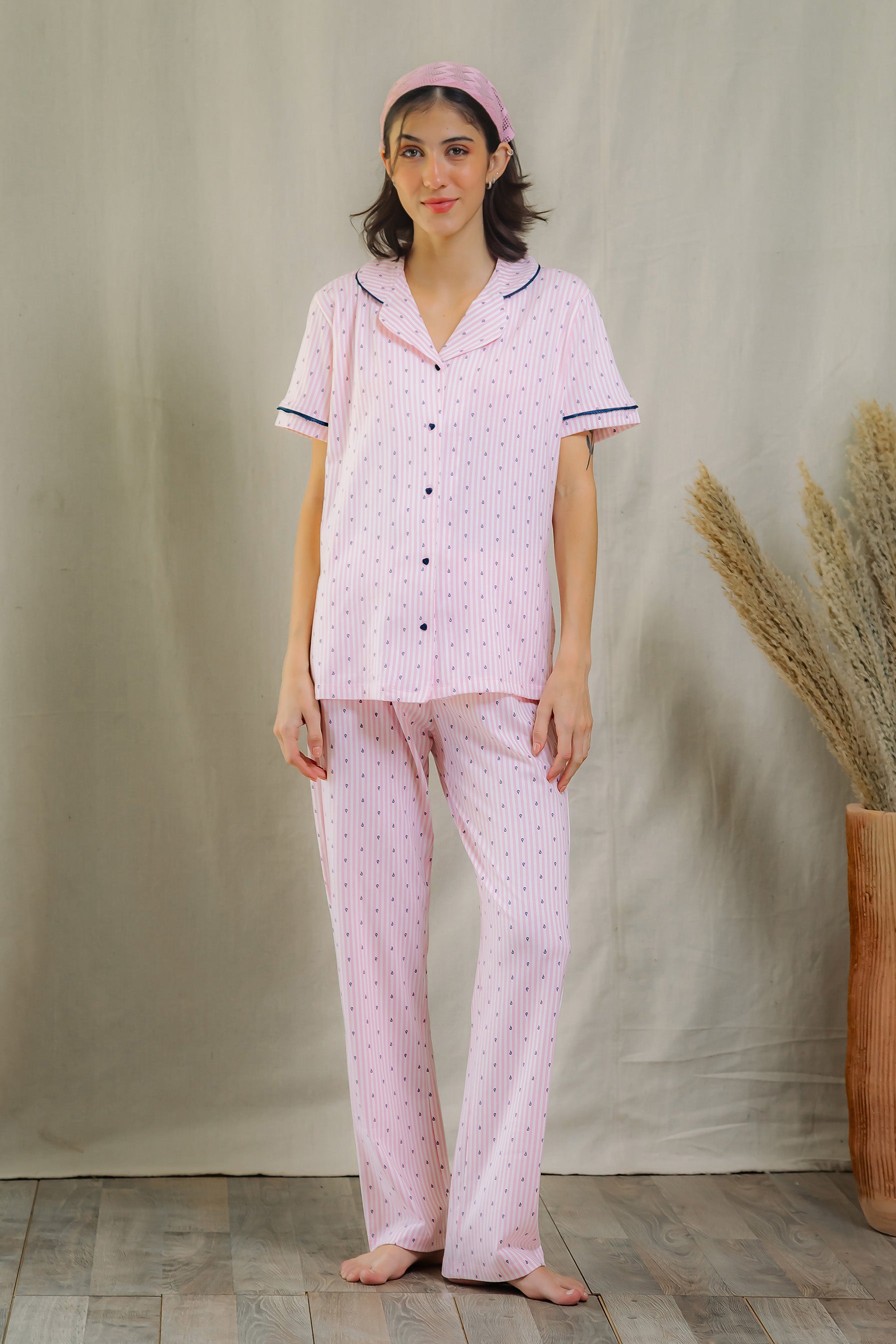 Step into serenity with our Paisley Striped Pajama Set, a full-length pajama ensemble crafted from ultra-soft cotton. Adorned with delicate Paisley Pattern on a soft pink striped base, this set blends sweetness and sophistication. The navy piping detail and button accents add a crisp finish, while the relaxed cut ensures all-night comfort. Whether you’re unwinding at home or savoring a slow morning, this set brings timeless charm to your loungewear collection.