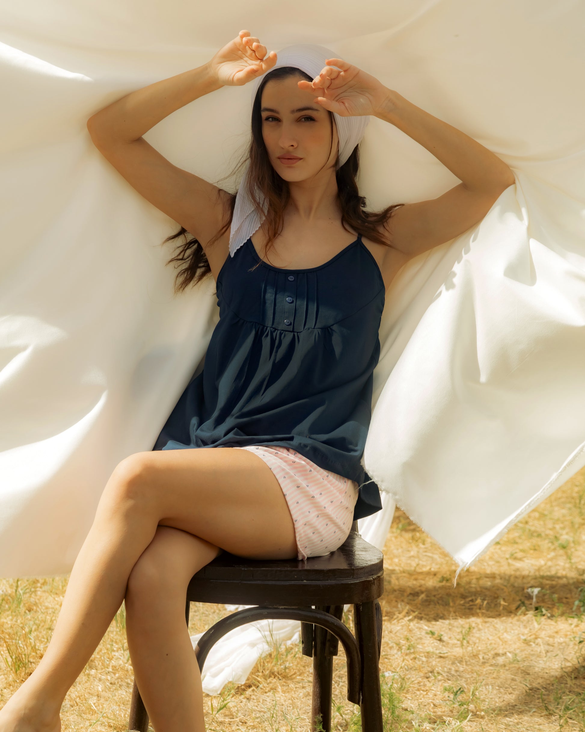 Soft, simple, and effortlessly charming — the Midnight paisley Short Set brings together playful pink stripes and sweet navy Paisley Pattern for a fresh bedtime look. The navy spaghetti-strap top features delicate pleats and button detail on the front, paired with light pink shorts sprinkled with tiny Paisley Pattern for a touch of feminine fun. Designed with breathable fabric and an airy silhouette, it’s perfect for warm nights and lazy mornings. The back falls softly with gathered fabric for extra comfort and style.