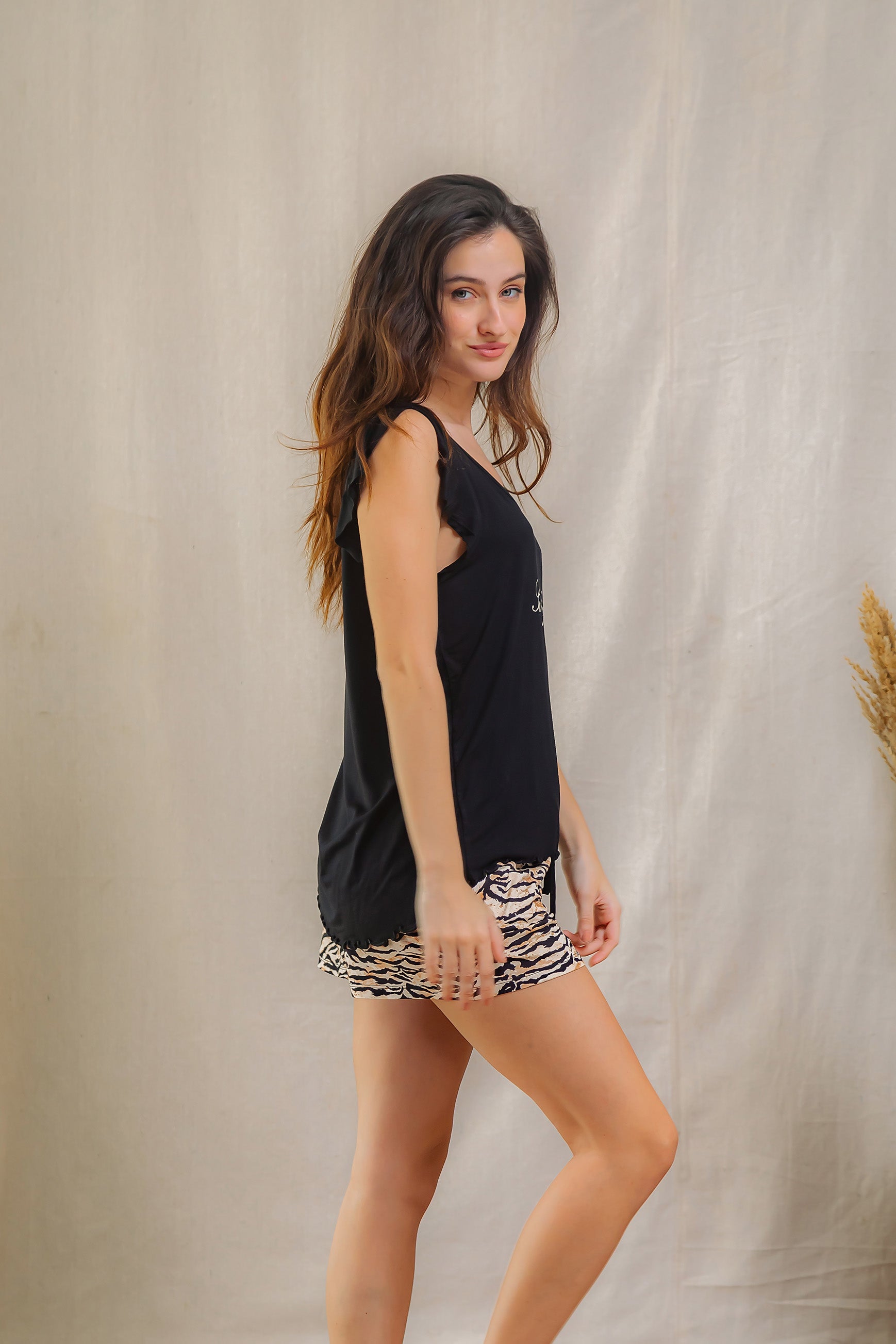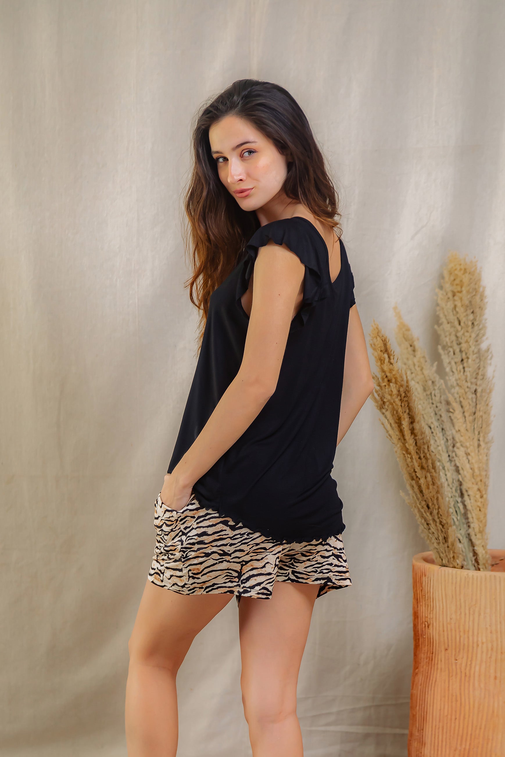 Stay cool and stylish with this trendy two-piece pajama set. The soft black top features flutter sleeves and a printed “Simplicity” slogan, paired with beige tiger print shorts for a bold, comfy look.