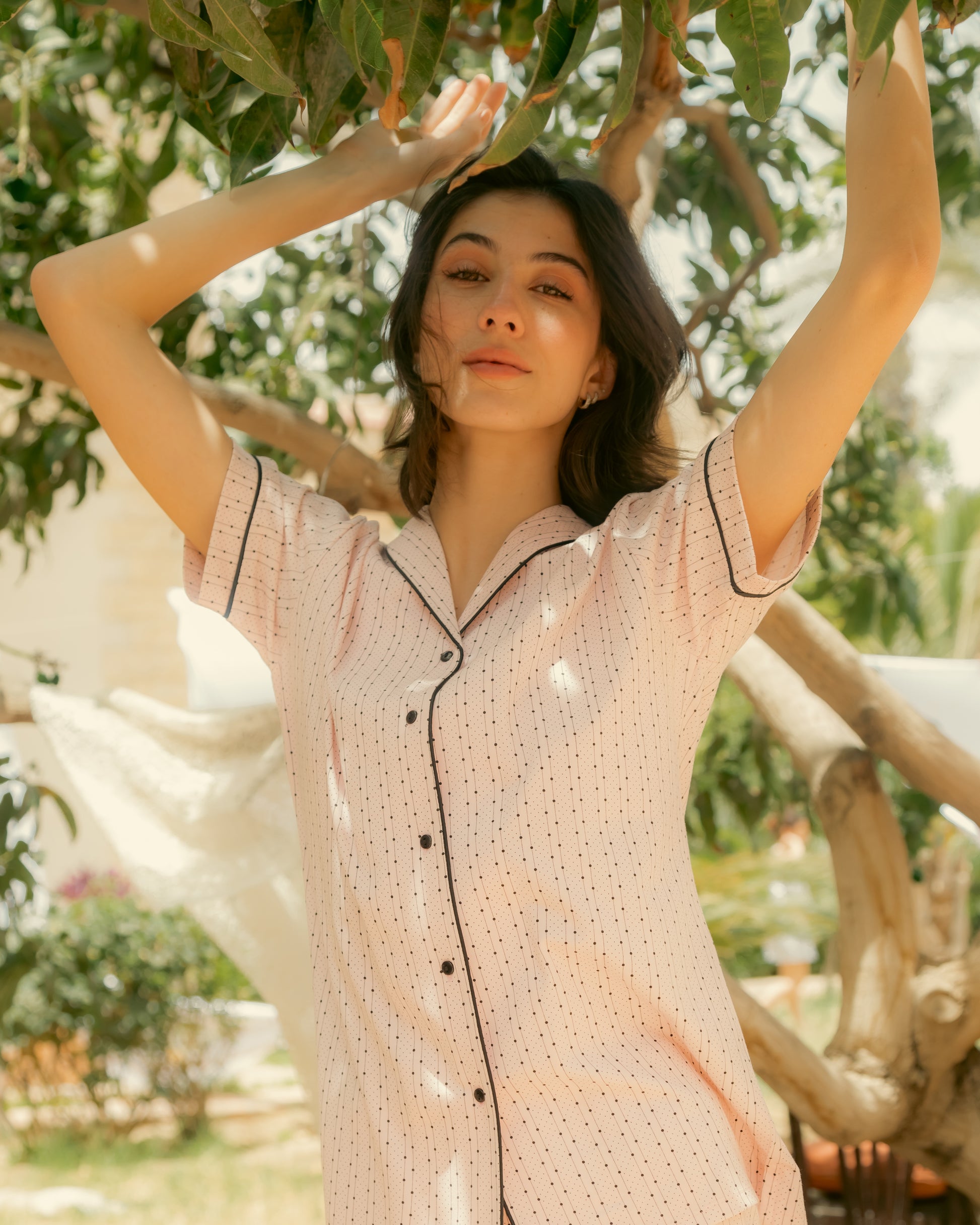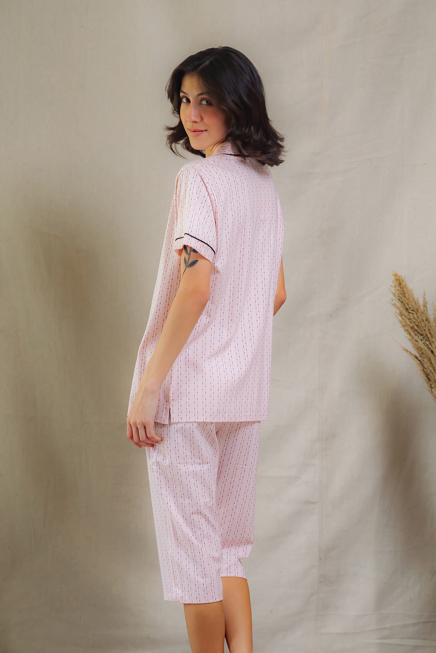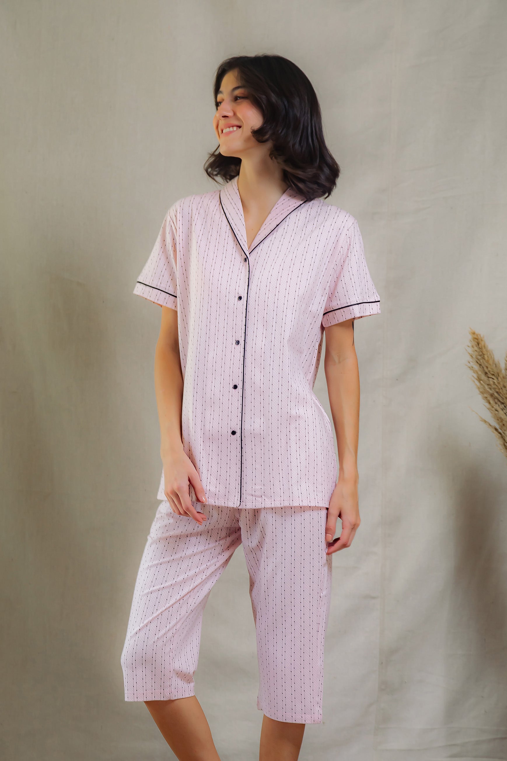Effortless comfort with a tailored touch. This cropped pajama set features a short-sleeve button-up top with classic dotted paired with mid-calf pants for breezy ease. A timeless choice for quiet mornings and cozy nights.
