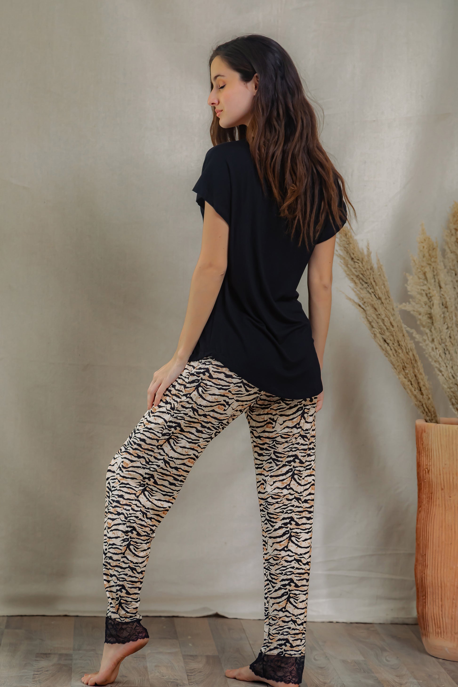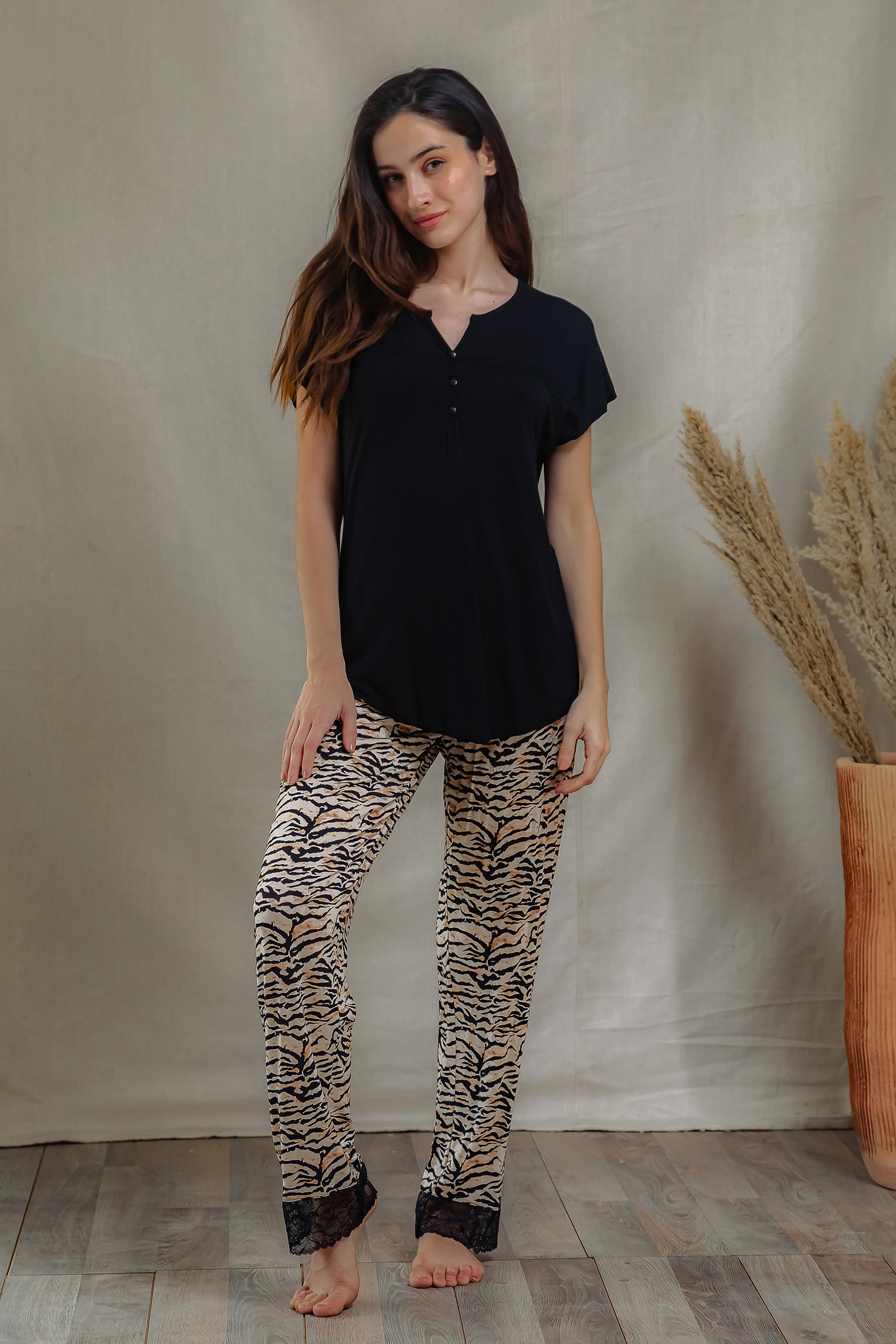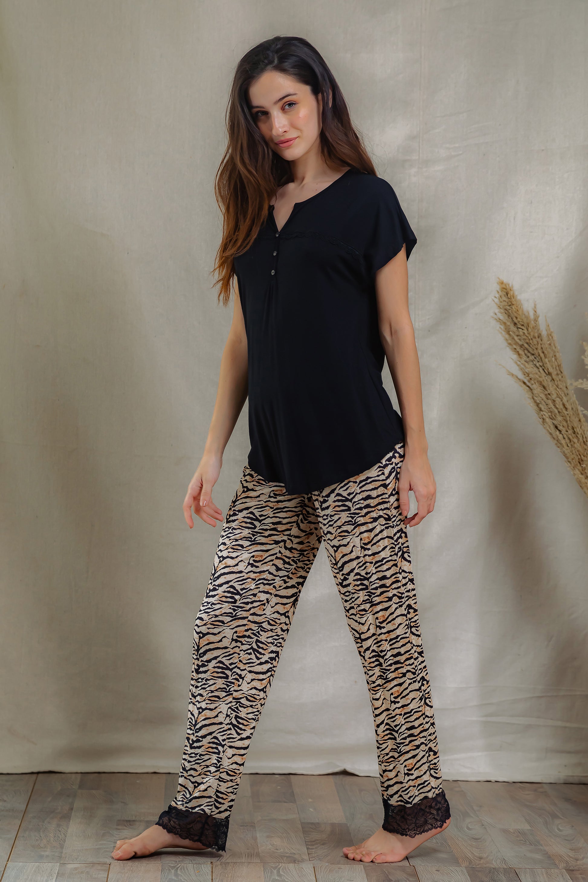 A sleek and comfy pajama set featuring a solid black top with button detail, paired with eye-catching tiger print pants. The pants are finished with a delicate black lace trim for a feminine touch.