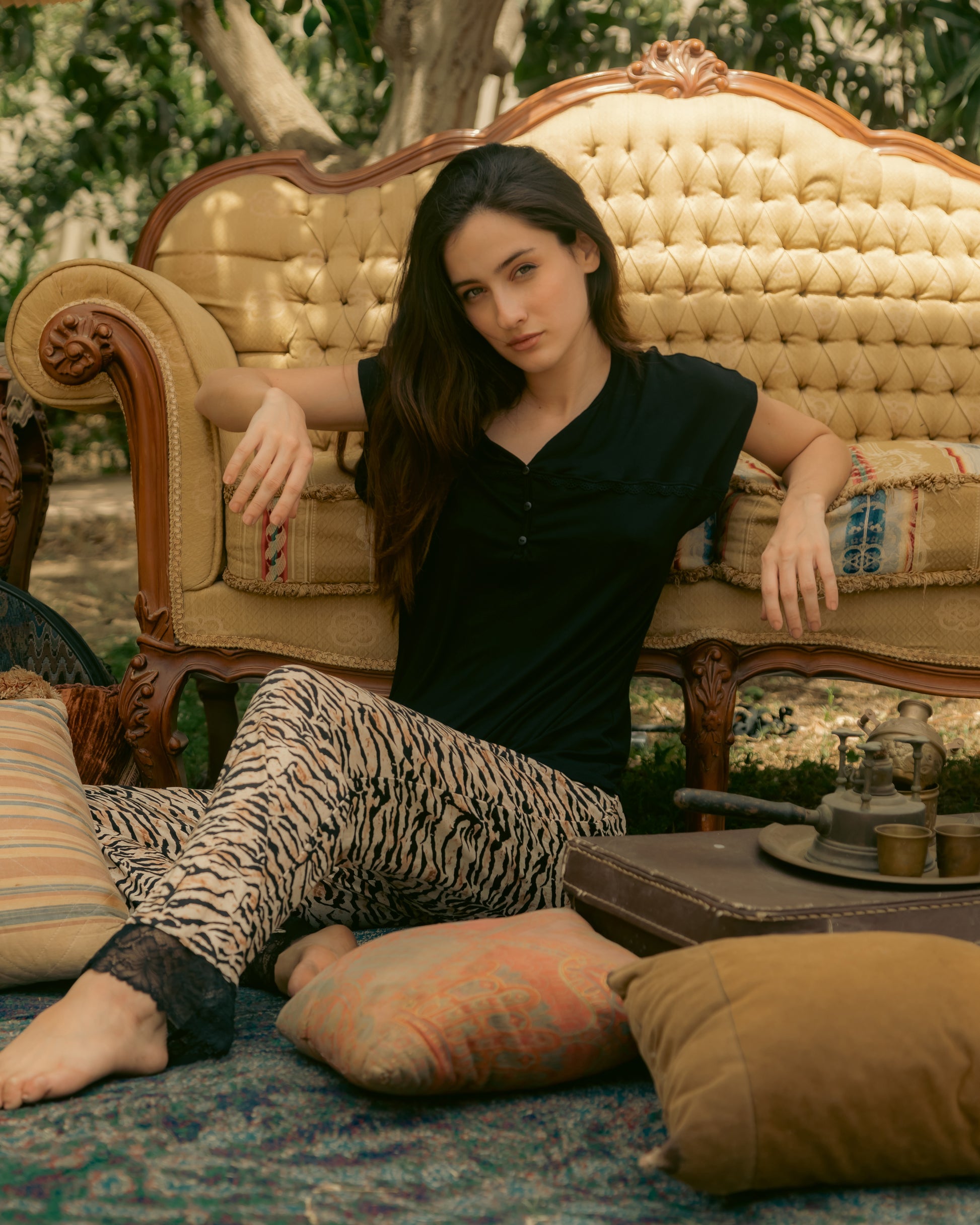 Bottoms: Beige tiger print with black lace hem